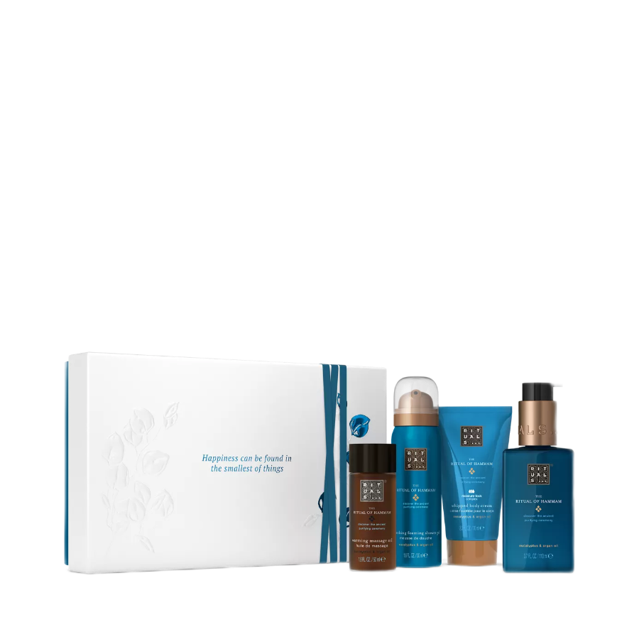 Маленький подарочный набор The Ritual of Hammam Погрузитесь в одну из старейших очищающих традиций с этим набором, вдохновленным очищающими ритуалами турецких бань-хамамов. Внутри вы найдете пену для душа, массажное масло, крем для тела и жидкое мыло для рук. Композиция, обогащенная розмарином, аргановым маслом и эвкалиптом. В набор входят: · Пенящийся Гель для Душа (50 мл) · Массажное Масло (50 мл) · Крем для Тела (70 мл). · Жидкое Мыло для Рук (110 мл)